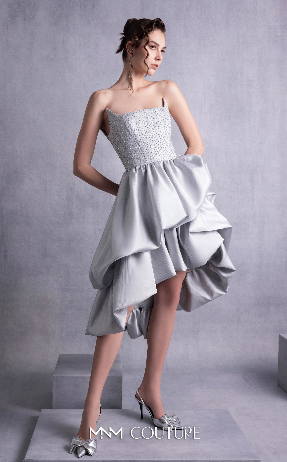 Experience the epitome of refined glamour with MNM Couture GOS2538, a Silver Embroidered Angled Bust Mikado Piqué Dress that redefines sophistication. Made from luxurious silver Mikado piqué, this strapless masterpiece features a sleek, angled bust design, perfectly blending modern structure with timeless elegance. The delicately embroidered bodice adds a touch of sparkling intricacy, while the voluminous, layered ruffled skirt creates a dramatic and captivating silhouette. Designed to command attention, this dress is ideal for red-carpet events and high-profile occasions, showcasing MNM Couture’s dedication to craftsmanship and couture artistry.